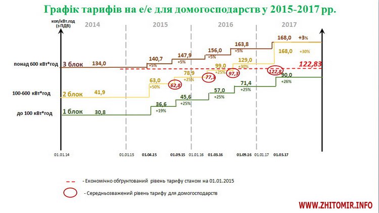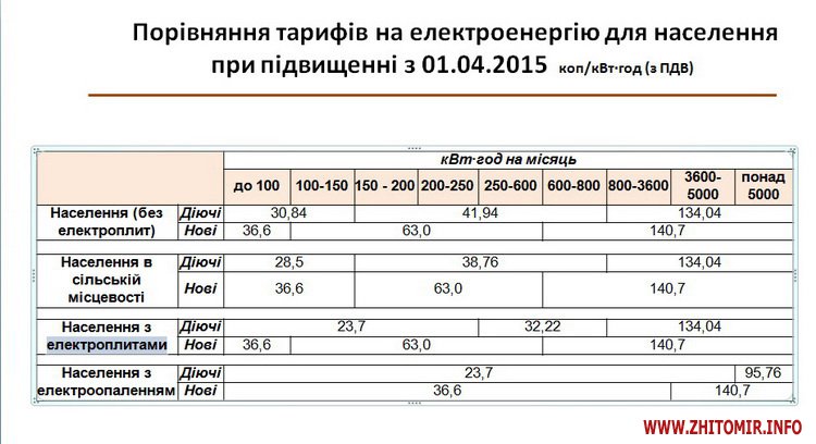 На першому етапі, починаючи з 1 квітня 2015 року, вартість електричної енергії для населення збільшується в середньому за умови споживання у місяць: