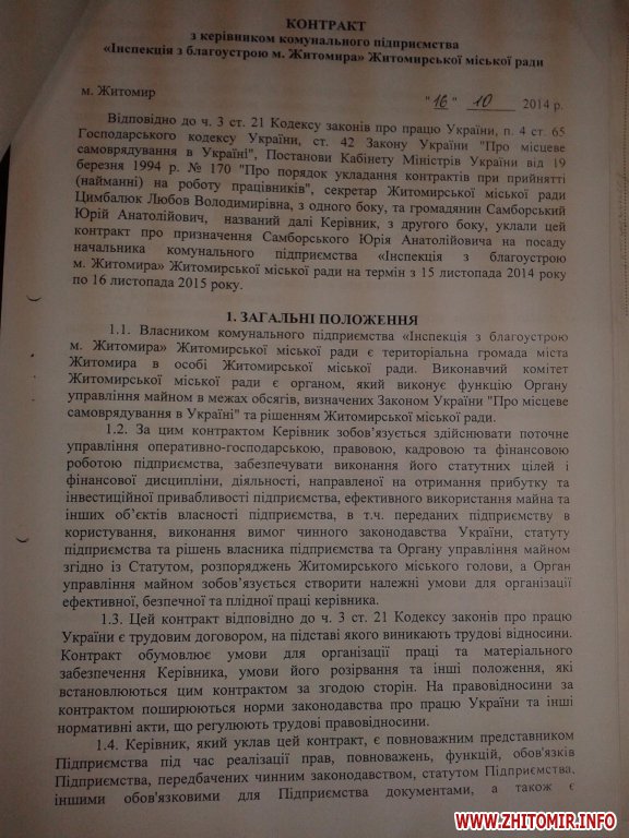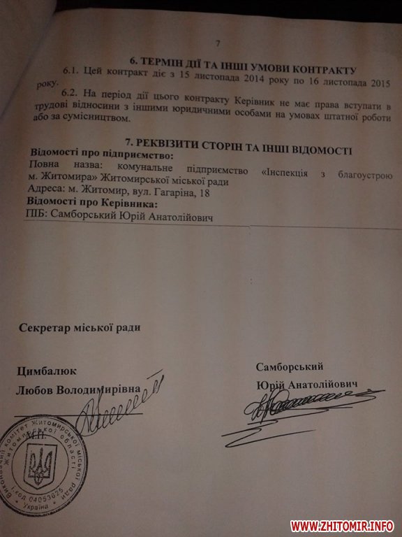 Депутату Житомирської міської ради Юрію Самборському «втиху» продовжили контракт і тепер до 16 листопада 2015 року може спокійно продовжувати працювати начальником інспекції з благоустрою.