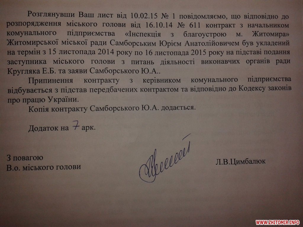 «4 березня 2015 року голова Житомирської міської організації ВО «Свобода» Віктор Брокарєв отримав відповідь на другий запит по призначенню начальника комунального підприємства «Інспекція з благоустрою м. Житомира» Житомирська Міська Рада. Згідно відповіді міськради контракт продовжили ще на рік з активним членом партії регіонів Юрієм Самборським. Громадськість міста обурена таким призначенням та не дозволить колишнім регіоналам очолювати важливі для Житомира підприємства», - пише Моісеєнко.