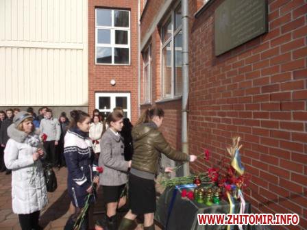 Відкрили меморіальну дошку під супровід пісні «Плине кача», після чого учні колегіуму, схиливши голови в скорботі, поставили під пам’ятною дошкою запалені лампадки.