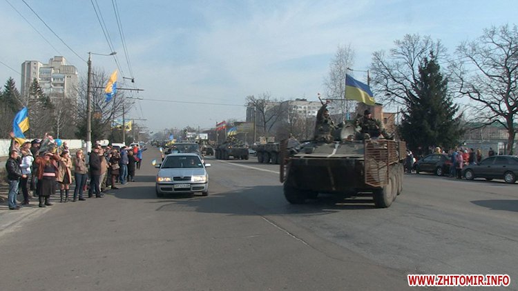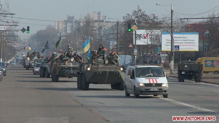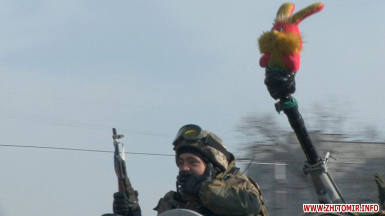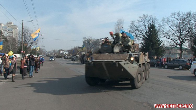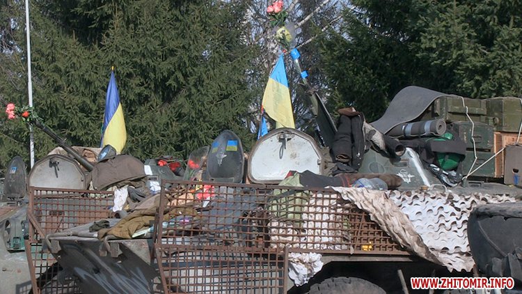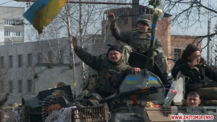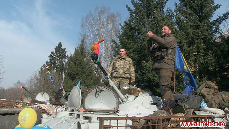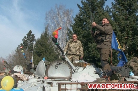 У Житомир прибули не всі бійці – частина колони з технікою і досі у дорозі. Шлях додому для житомирських «кіборгів» виявився справжнім випробуванням: через поломки і вимушені зупинки у дорозі вони провели три доби. Опинившись на території частини, бійці шампанським поливають свої БТРи.