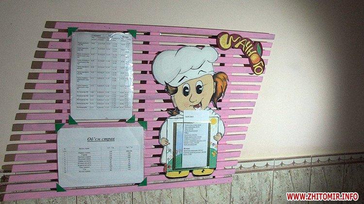 Старша медсестра ДНЗ №55 Наталія Сікан зачитує меню: «На сніданок була каша ячнева, ікра кабачкова та хліб обідній. На обід сьогодні дітки їли бурячник, картопляне пюре, тюфтелю м'ясну, салат з квашеної капусти, напій соку та хліб. І на полуденок дітки будуть їсти творожну запіканку, кавовий напій на молоці та батон».