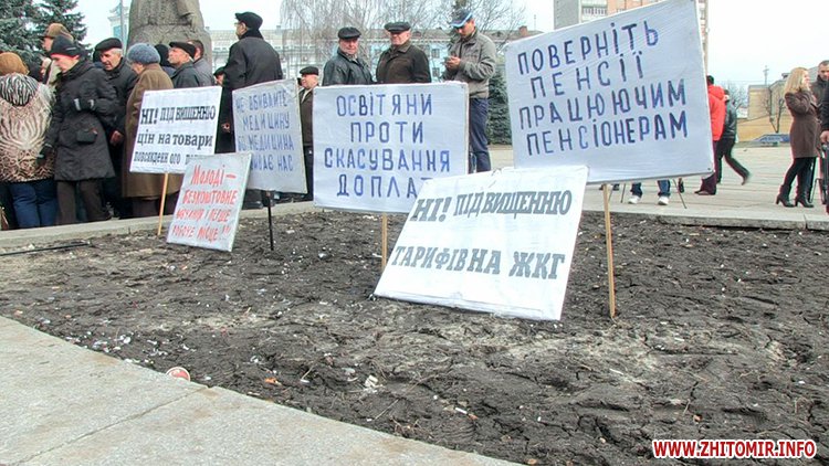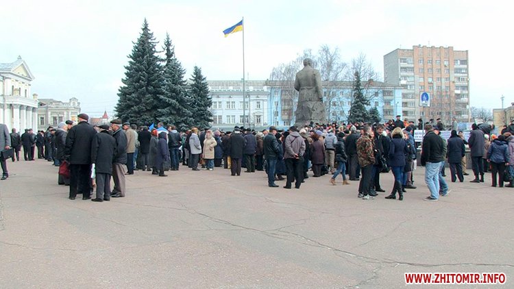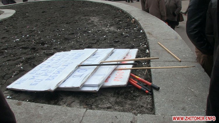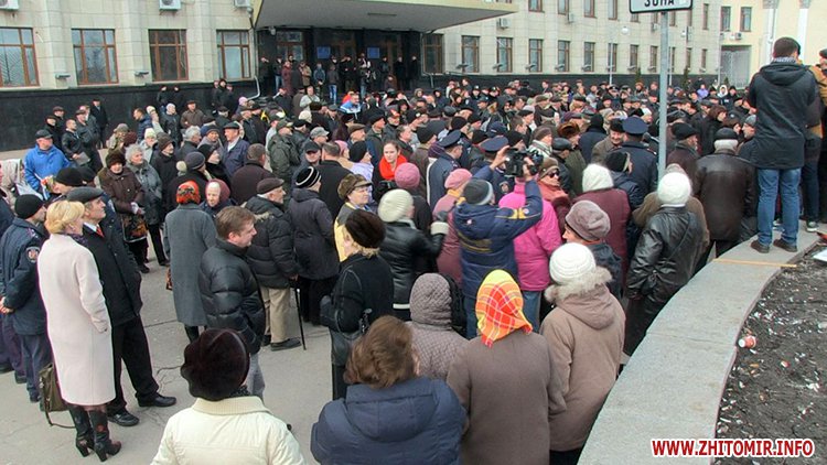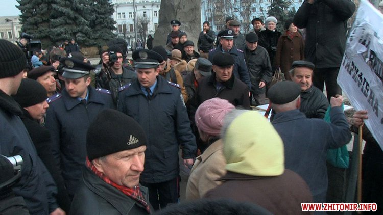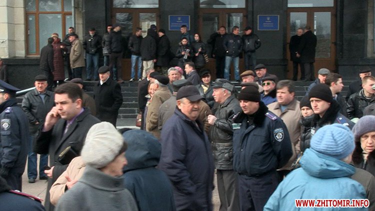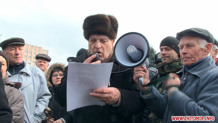 «Ми прийшли сюди з однією вимогою - припинити ту політику влади, яку вона сьогодні проводить. Це підвищення цін, це девальвація гривні, тобто ви самі бачите, скільки сьогодні долар, ціни на бензин. Ми вимагаємо, щоб молодь могла сьогодні отримати і безкоштовну освіту, і перше робоче місце, тому що сьогодні роботи в Україні немає. Сьогодні з цими вимогами ми вийшли під Житомирську обласну раду, щоб висловити протест проти цієї політики влади», - розповівє перший секретар Житомирського обласного комітету Ленінського комсомолу України Сергій Кучер.