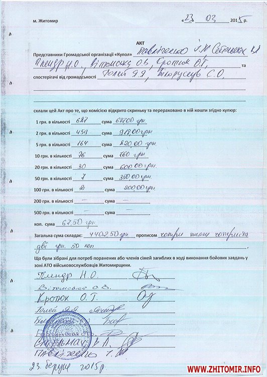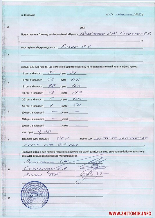 Комісія встановила, що за останні півтора місяця житомиряни та гості міста пожертвували 4 тис. 402 грн. 50 коп.