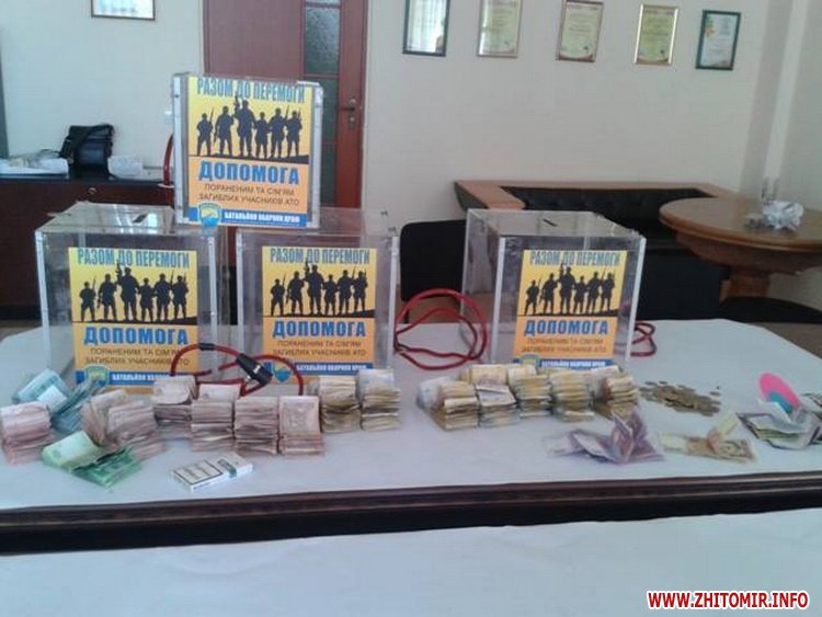 23 березня у Житомирі було проведено чергову виїмку вмісту прозорих скриньок для збору допомоги пораненим під час бойових дій у зоні АТО військовослужбовцям Житомирської області, що встановлені в ТРЦ «Глобал.UA».