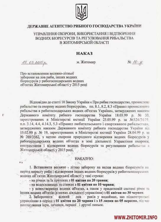 Наказ про встановлення весняно-літньої заборони на лов риби та інших водних біоресурсів у рибогосподарських водних об’єктах Житомирської області у 2015 році опублікований на офіційному сайті управління рибоохорони в Житомирській області.