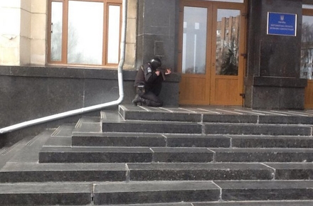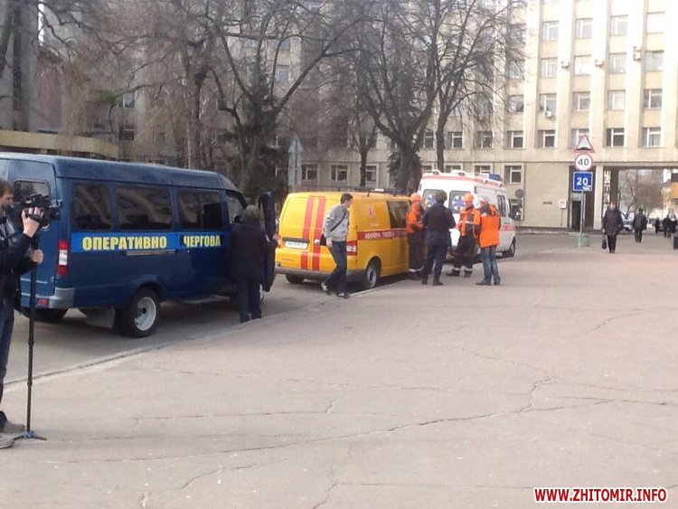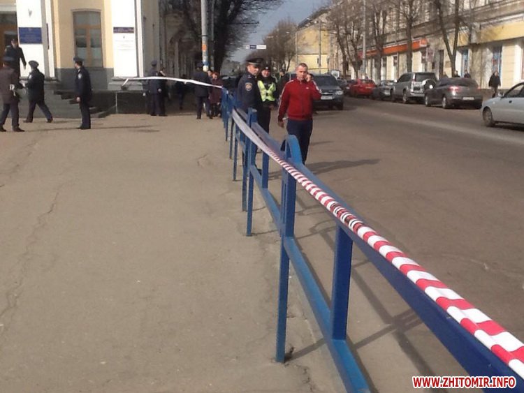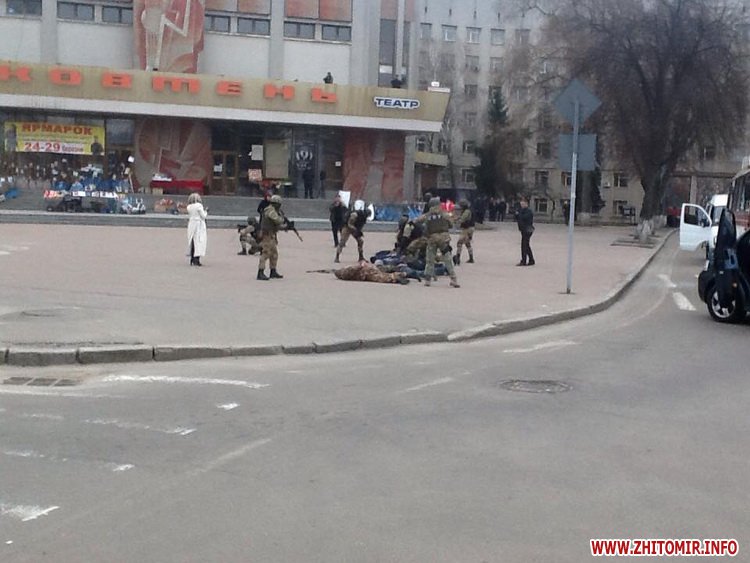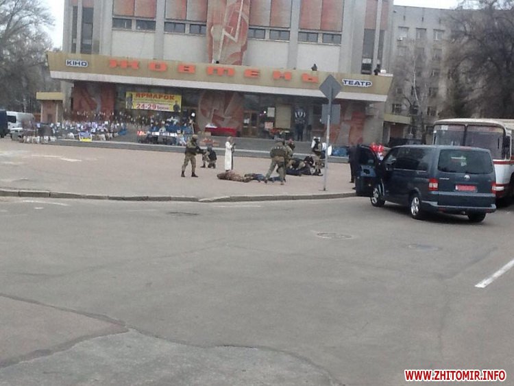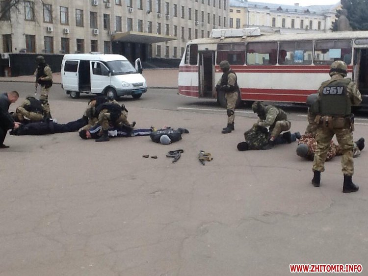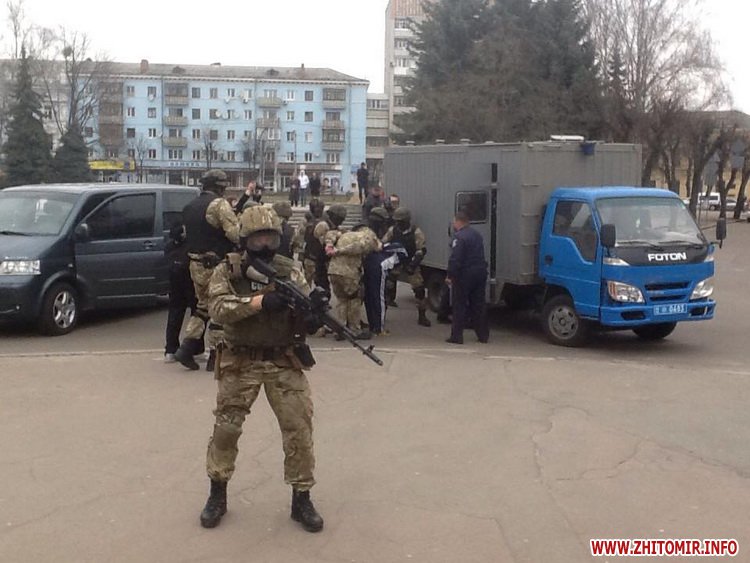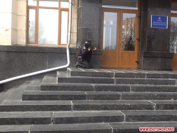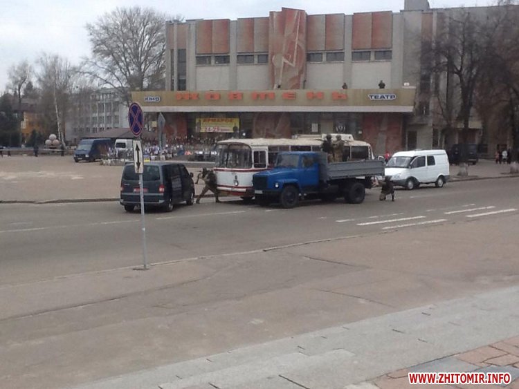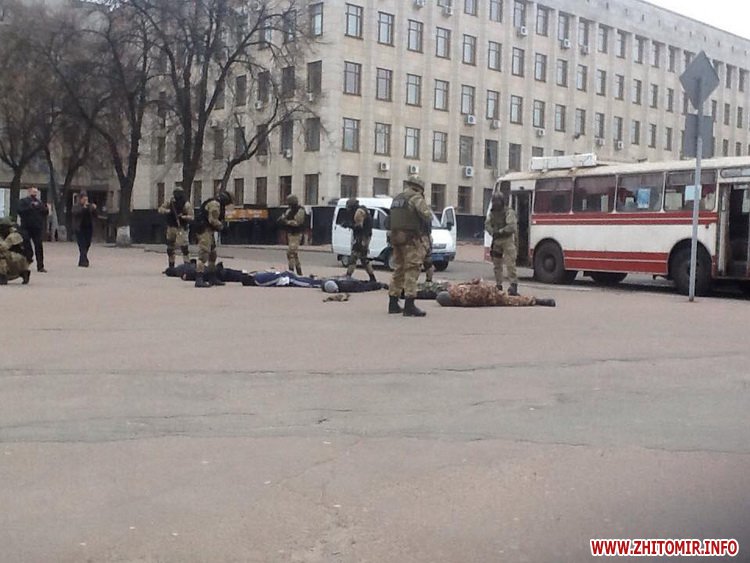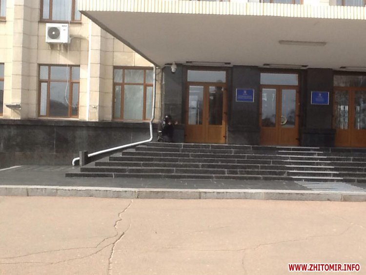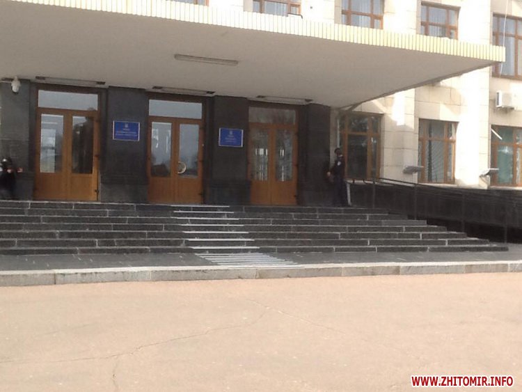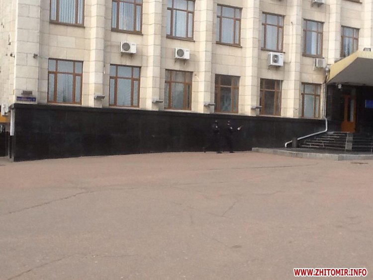 Утром 27 марта площадь Королева, где находится Житомирская облгосадминистрация и областной совет, оцеплена сотрудниками милиции. Возле входа в админздание находятся люди в форме и с автоматами.