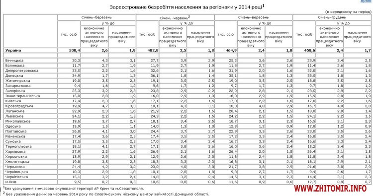 На кінець 2014 року у Житомирській області нараховувалось 18,8 тис. безробітних, що складало 2,5% до населення працездатного віку.