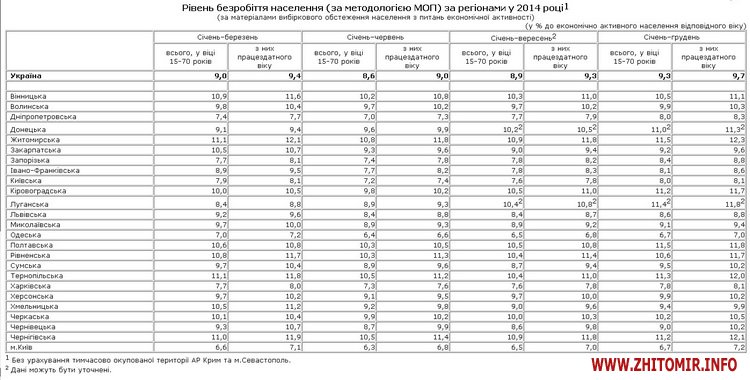 У розрахунках за методологією Міжнародної організації праці, наведених на сайті Держстату (показник «рівень безробіття за методологією МОП» визначається у відсотках як співвідношення чисельності безробітних віком 15-70 років до економічно активного населення відповідного віку) у січні-грудні 2014 року рівень безробіття в Україні складав 9,7% від загальної кількості економічно активного населення працездатного віку, причому на початку року цей показник складав 9% (дані без урахування тимчасово окупованої території АР Крим та м. Севастополь). За методологією МОП, серед регіонів найвищий рівень безробіття на кінець року був зафіксований у Житомирській області – 12,3%.