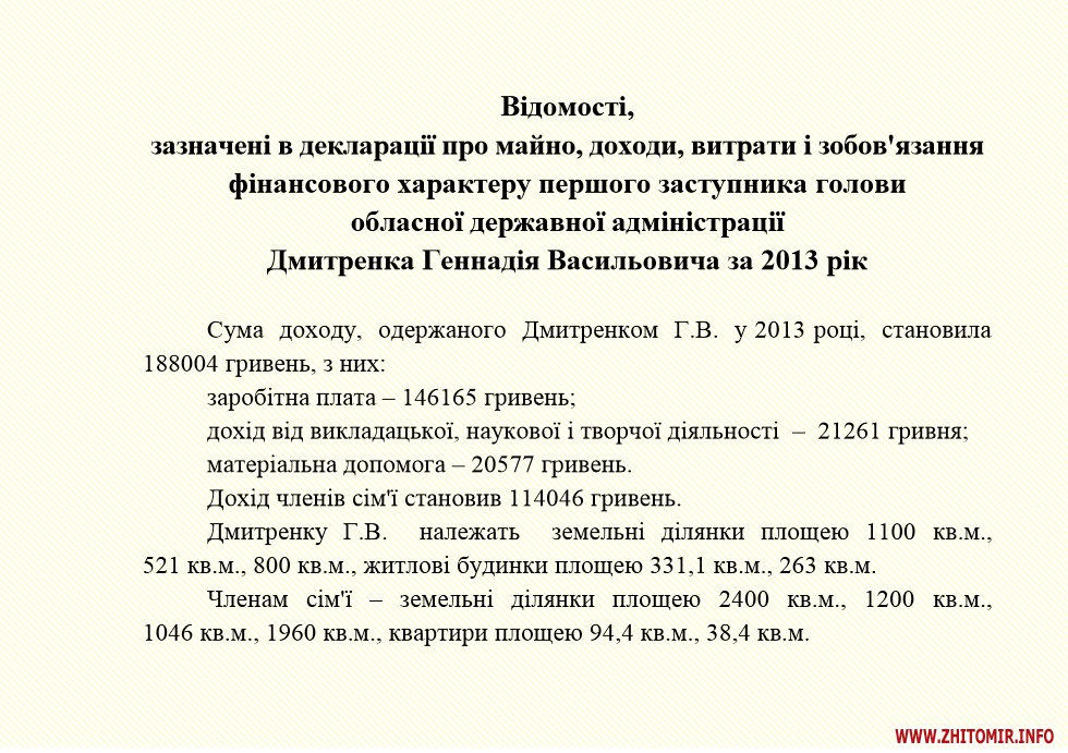 На сайте облгосадминистрации есть сведения о декларации первого заместителя губернатора за 2013 год: его годовой доход составлял 188 тыс.грн., членов семьи – 114 тыс.грн. Квартира площадью 263 кв.м. и земельный участок площадью 800 кв.м тогда принадлежала Геннадию Дмитренко, а в 2014 году это стало собственностью членов семьи.
