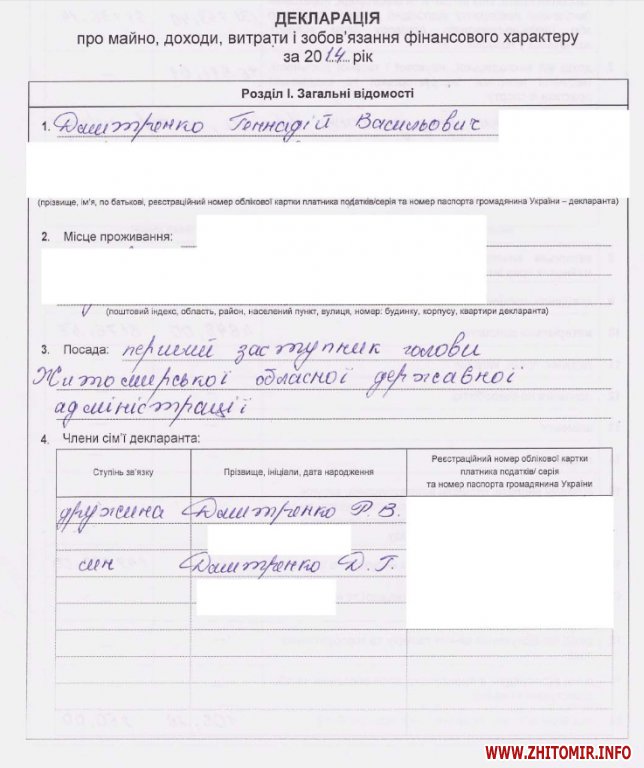 Первый заместитель губернатора Житомирской области Геннадий Дмитренко за 2014 год заработал 153 тыс.грн.
