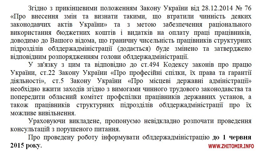 «З метою забезпечення раціонального використання бюджетних коштів і видатків на оплату праці працівників, доводимо до Вашого відома, що граничну чисельність працівників структурних підрозділів облдержадміністрації (додається) буде змінено та затверджено відповідним розпорядженням голови облдержадміністрації. У зв'язку з цим та відповідно до ст.494 Кодексу законів про працю України, ст.22 Закону України «Про професійні спілки, їх права та гарантії діяльності», ст.5 Закону України «Про місцеві державні адміністрації» необхідно вжити заходів згідно з вимогами чинного трудового законодавства та попередити обласний комітет профспілки працівників державних установ, а також працівників структурних підрозділів облдержадміністрації про їх можливе вивільнення», - йдеться у листі.