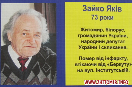 Яків Зайко народився в Білорусі, але присвятив своє життя боротьбі за незалежність України. В кінці 1980-х років Яків Якович організовував багатолюдні мітинги у Житомирі. Про його авторитет та впливовість свідчить той факт, що у 1990 році громадський діяч став народним депутатом України від Народного Руху.