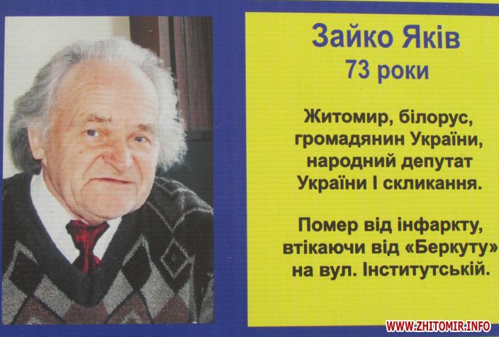 «На майдані імені С.П. Корольова відбувся мітинг-реквієм, який зібрав громадських активістів та жителів обласного центру. Віддати шану пам’яті, помолитися за упокій душі Якова Зайка та його побратимів і покласти квіти до стели Героїв Небесної Сотні прийшли і представники влади – заступник голови обласної ради Руслан Годований та заступник Житомирського міського голови Олександр Бочковський», - йдеться у повідомленні.