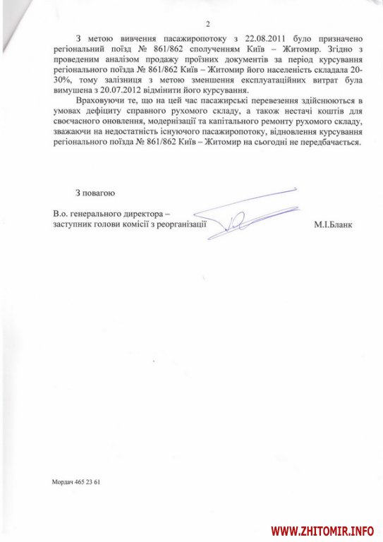 «З метою вивчення пасажиропотоку з 22.08.2011 було призначено регіональний поїзд №861/862 сполученням Київ-Житомир. Згідно з проведеним аналізом продажу проїзних документів за період курсування регіонального поїзда №861/862 Київ-Житомир його населеність складала 20-30%, тому залізниця з метою зменшення експлуатаційних витрат була змушена з 27.07.2012 відмінити його курсування. Враховуючи те, що на цей час пасажирські перевезення здійснюються в умовах дефіциту справного рухомого складу, а також нестачі коштів для своєчасного оновлення, модернізації та капітального ремонту рухомого складу, зважаючи на недостатність існуючого пасажиропотоку відновлення курсування регіонального поїзда №861/862 Київ-Житомир на сьогодні не передбачається», - пояснюється у листі, який підписав в.о. генерального директора «Укрзалізниці» Максим Бланк.