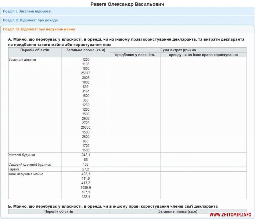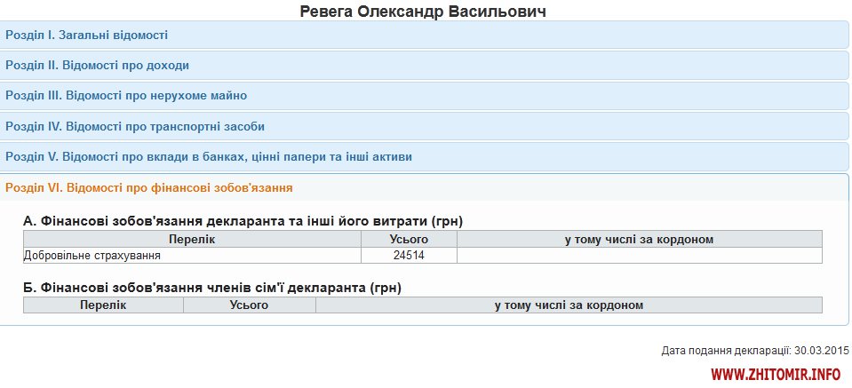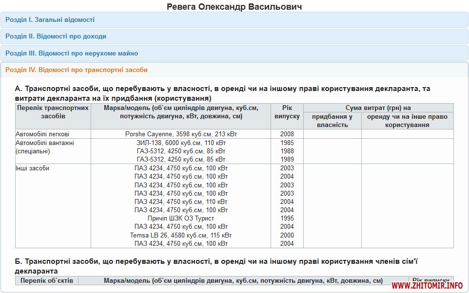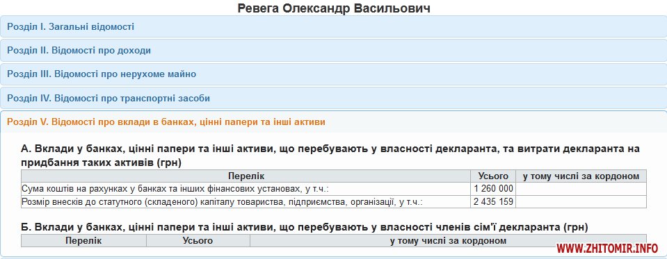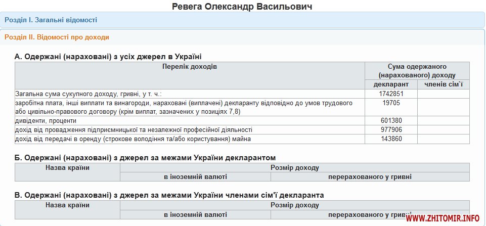 Как сообщал Житомир.info, доходы Александра Ревеги в 2013 году составляли 1 млн. 901 тыс. 641 грн., а на счетах в банках и финансовых учреждениях у него было 3 млн.588 тыс. 477 грн.