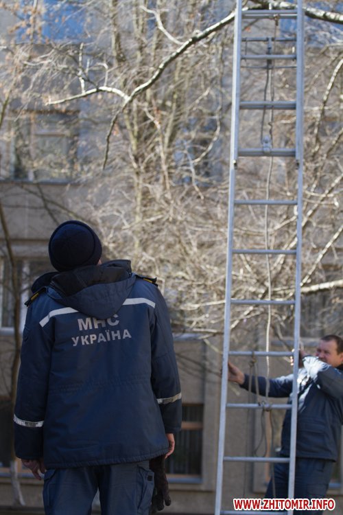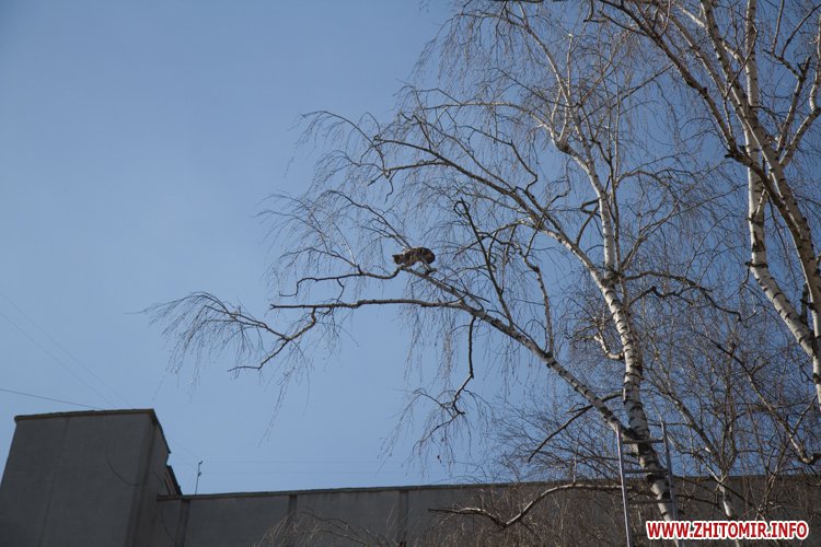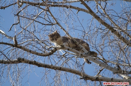 10 апреля около полудня прохожие заметили кота, который забрался на березу высотой около 10 метров между зданиями Житомирской областной госадминистрации и кинотеатра «Жовтень».