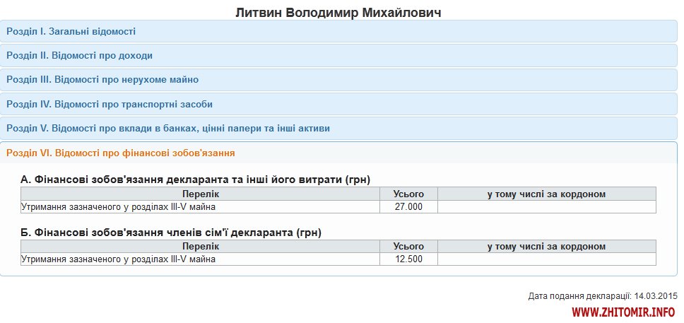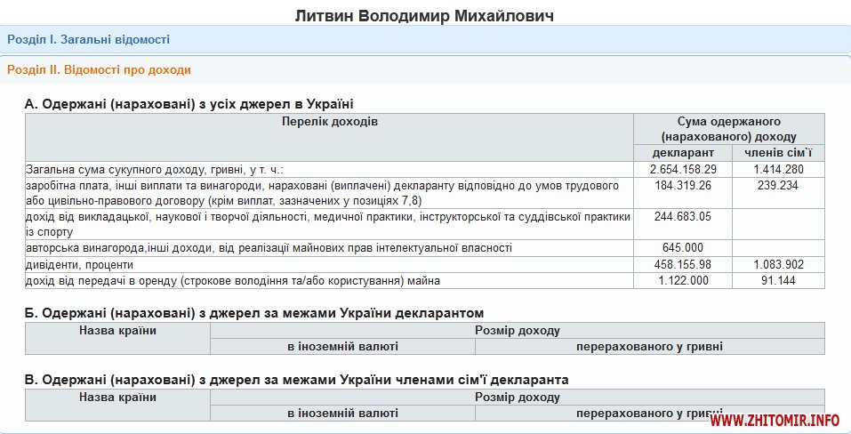 Доходы народного депутат от Новоград-Волынского округа Владимира Литвина за прошедший год увеличились почти на миллион гривень: в 2013 году он задекларировал 1 млн. 778 тыс. 996 грн., в 2014 – 2 млн. 654 тыс. 158 грн.