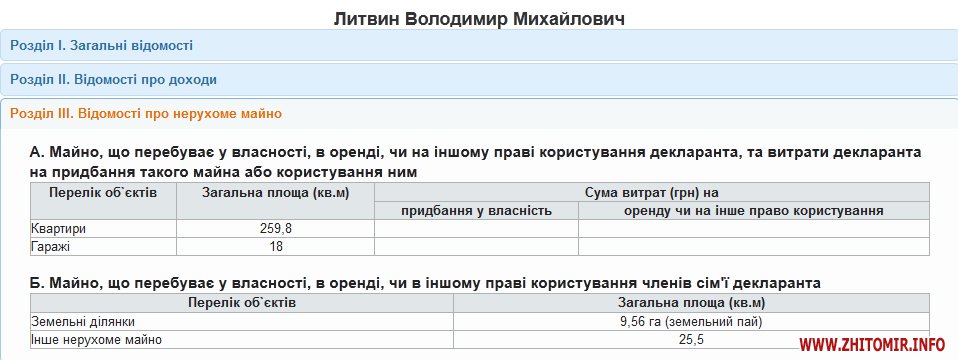 Владимиру Литвину принадлежит квартира общей площадью 259,8 кв.м и гараж – 18 кв.м. У жены есть земельный пай 9,56 га и другое недвижимое имущество площадью 25,5 кв.м.