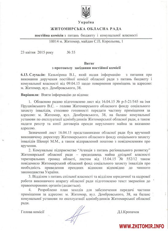 Члени постійної комісії з питань бюджету і комунальної власності заслухали представників ГО «Житомирський обласний Фонд соціального захисту інвалідів» та інших присутніх. Проте дійшли одностайного рішення, що розпоряджатися коштами і майном територіальних громад області має обласна рада, а не приватна структура. Крім того, якщо дана ситуація затягнеться ще на 10 років, ремонтувати імовірно вже не буде що.