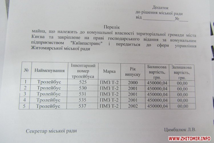 «С целью улучшения городских пассажирских перевозок троллейбусами, дать согласие на принятие в сферу управления Житомирского горсовета движимого имущества – движимого электрического состава (троллейбусы марки ПМЗ Т-2 в количестве пять единиц), что принадлежит к коммунальной собственности территориальной общины города Киева и закреплено на правах хозяйственного ведения за КП «Киевпасстранс», - говорится в принятом на сессии решении.