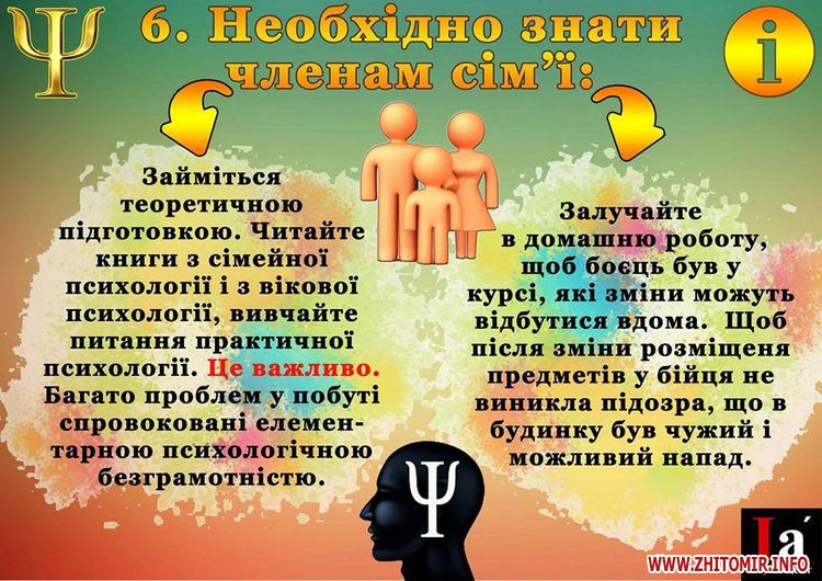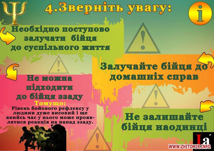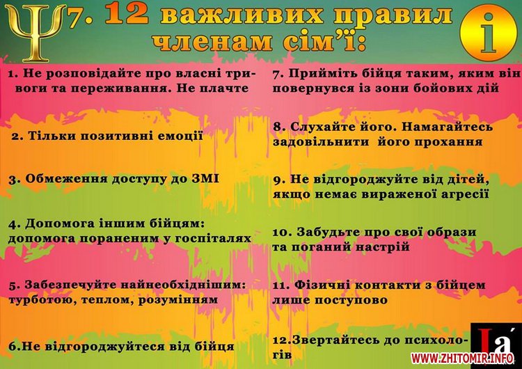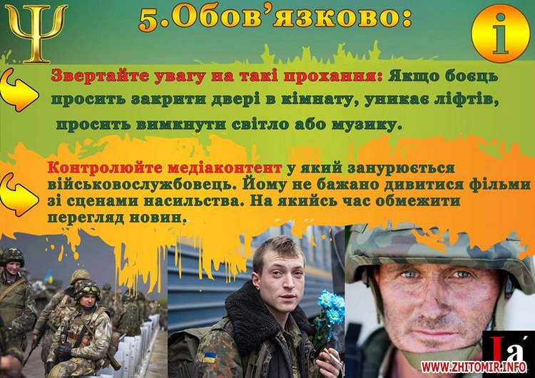 Не залишайте бійця наодинці, залучайте до домашніх справ, обмежуйте перегляд ним новин. Задовольняйте прохання закрити двері в кімнату, вимкнути світло або музику.