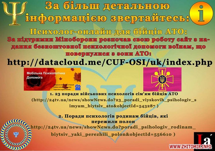 Працює сайт з надання безкоштовної психологічної допомоги воїнам, що повернулися з АТО - http://datacloud.me/CUF-OSI/uk/index.php.
