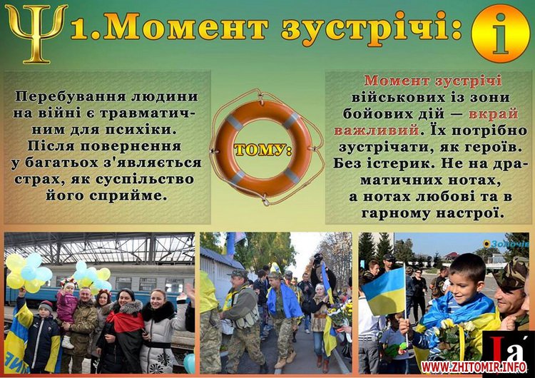 «Перше. Момент зустрічі. Перебування людини на війні є травматичним для психіки. Після повернення у багатьох з’являється страх, як сприйме його суспільство. Момент зустрічі військових із зони бойових дій – вкрай важливий. Їх потрібно зустрічати як героїв – без істерик», - таким є перше правило у переліку розміщених на сторінці Міноборони у Facebook.