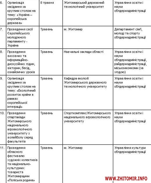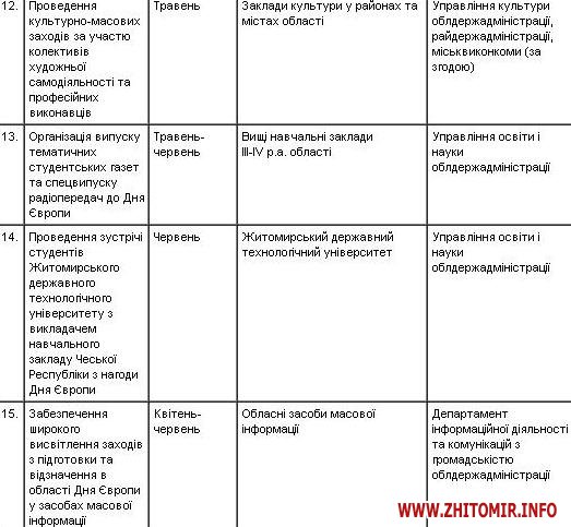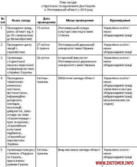На сайті обласної адміністрації оприлюднене відповідне розпорядження голови ОДА з планом заходів, які мають відбуватися у Житомирській області під час святкування Дня Європи в Україні.