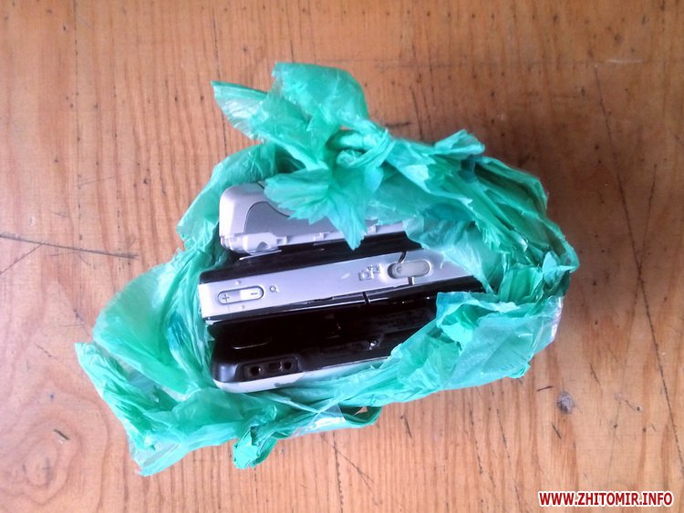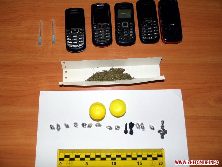 А вже 29 квітня о 6 годині ранку невідомою особою було здійснено перекид пакунку на територію автомобільних боксів господарчого двору Житомирської установи виконання покарань (№8). Співробітники оперативної групи за сигналом, який надійшов від чатового однієї із веж, виявили підозрілий поліетиленовий пакунок та відразу викликали слідчо-оперативну групу Житомирського МВ УМВС України в області. Працівниками міліції було оглянуто місце події та вилучено пакунок, в якому знаходилось 14 міцно запаяних у поліетилен невеличких пакуночків з невідомою речовиною, хрестик сріблястого кольору, 5 мобільних телефонів та буро-зелена речовина рослинного походження.