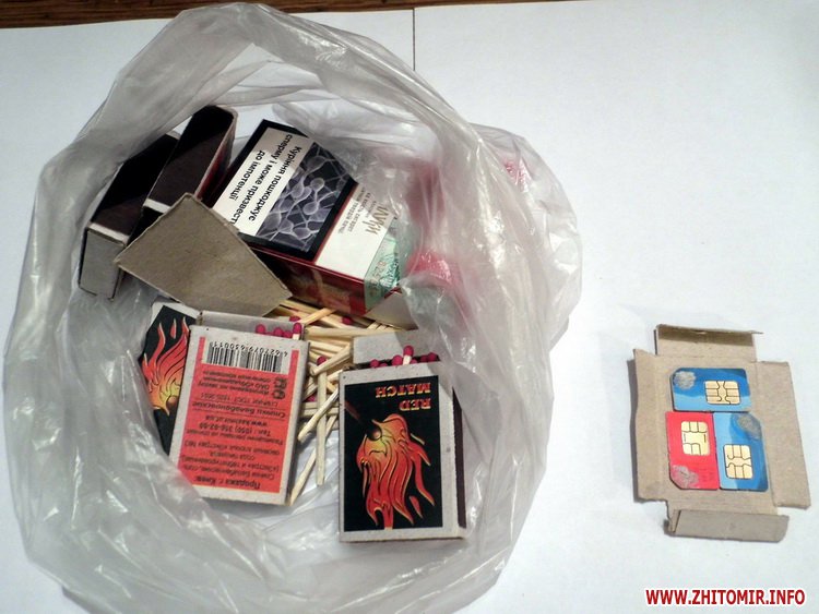 15 квітня під час догляду продуктової передачі для слідчозаарештованої К. від громадянина Г. увагу працівників Житомирської УВП-8 привернув поліетиленовий пакет, в якому знаходились цигарки та декілька коробів сірників. При більш детальному огляді сірників на дні одного сірникового коробка вдалось розгледіти три мобільних сім карти, які громадянин Г. намагався передати прихованим шляхом.