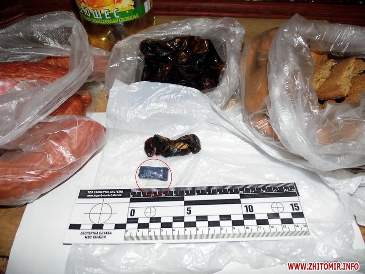 17 квітня під час догляду продуктової передачі для ув’язненого Ш. привернув увагу занадто великий сухофрукт фініка, саме в якому і було виявлено прихований поліетиленовий пакунок з кристалічною речовиною білого кольору. Передавав передачу мешканець міста Житомира громадянин В., який, залишивши передачу та документи, втік з місця події.