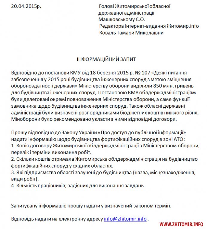 20 апреля Житомир.info отправил информационный запрос на имя губернатора Житомирской области Сергея Машковского о строительстве фортификационных сооружений на востоке Украины.