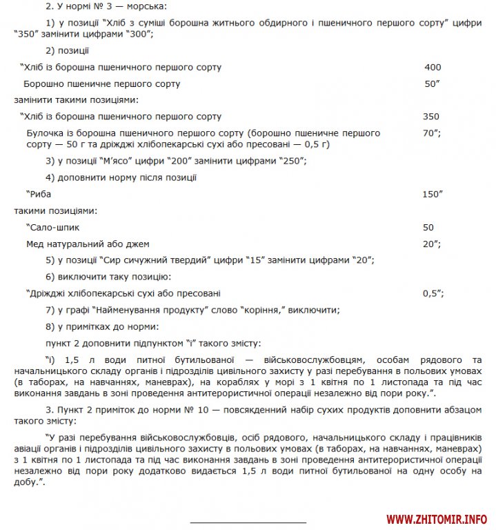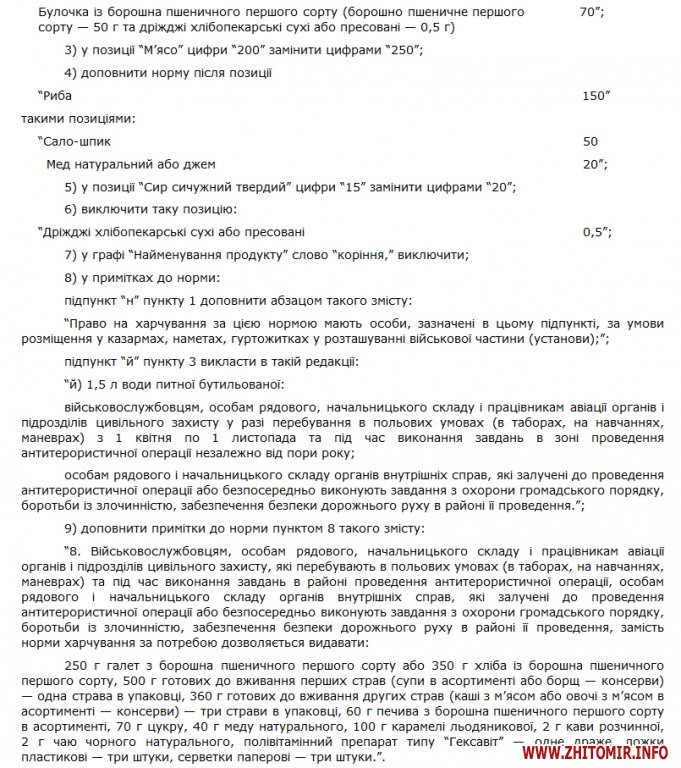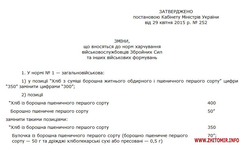 «Кабінет Міністрів України постановляє: внести до норм харчування військовослужбовців Збройних Сил та інших військових формувань, затверджених постановою Кабінету Міністрів України від 29 березня 2002 р. № 426 (Офіційний вісник України, 2002 p., № 14, ст. 739; 2006 p., № 11, ст. 716, № 50, ст. 3324; 2013 р., № 100, ст. 3663; 2014 р., № 51, ст. 1337, № 59, ст. 1598), зміни, що додаються», - йдеться у документі.