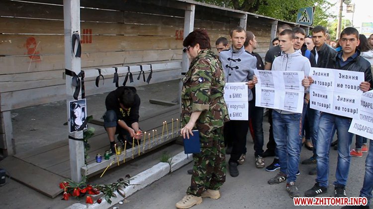 6 травня біля Бердичівського мед коледжу знову людно. Громадські активісти Житомирщини з’їхалися сюди через самогубство третьокурсниці, яка, не склавши сесію, вкоротила собі віку.