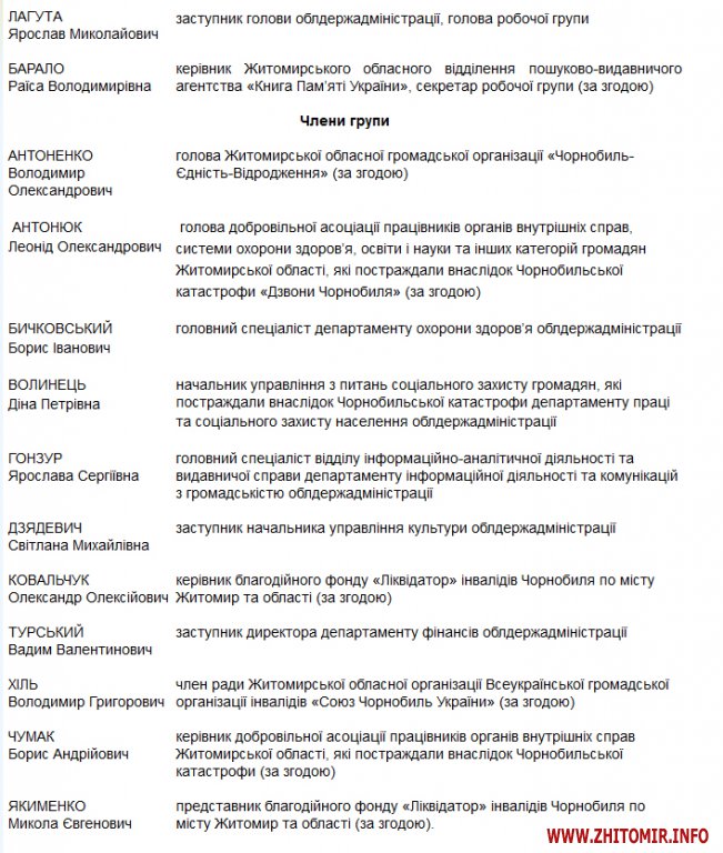 «Враховуючи звернення Житомирського обласного відділення Українського фонду соціальних гарантій військовослужбовців та ветеранів Збройних Сил України від 05.03.2015 № 70/6 щодо видання до 30-річчя Чорнобильської катастрофи обласної Книги Пам’яті «Чорнобильська трагедія» утворити робочу групу для збору матеріалів про жителів Житомирської області, які брали участь у ліквідації наслідків аварії на ЧАЕС та затвердити її склад», - йдеться у документі.