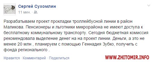 «Разрабатываем проект прокладки троллейбусной линии в район Маликова. Пенсионеры и льготники микрорайона не имеют доступа к бесплатному коммунальному транспорту. Сегодня бюджетная комиссия рекомендовала выделение денег на проект линии. Деньги, а это не менее 20 млн., планируем с помощью Геннадия Зубко, получить из фонда регионального развития», - написал на свой странице в фейсбук Сергей Сухомлин.