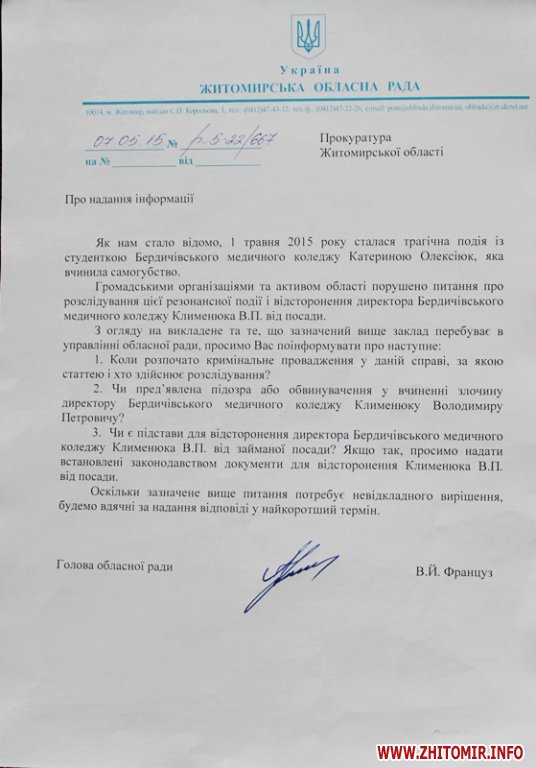 Голова Житомирської обласної ради Віталій Француз надіслав листи до прокуратури Житомирської області та управління внутрішніх справ з проханням відсторонити директора Бердичівського медичного коледжу від займаної посади.