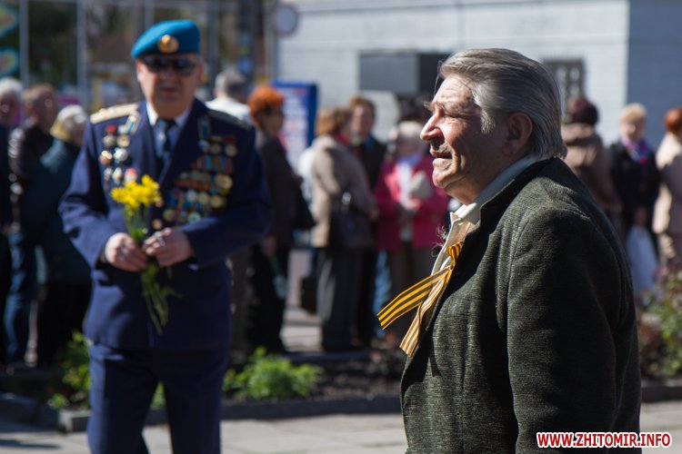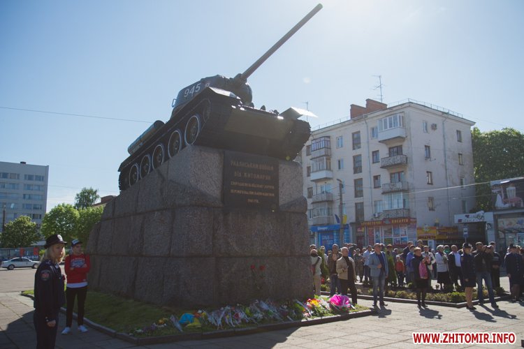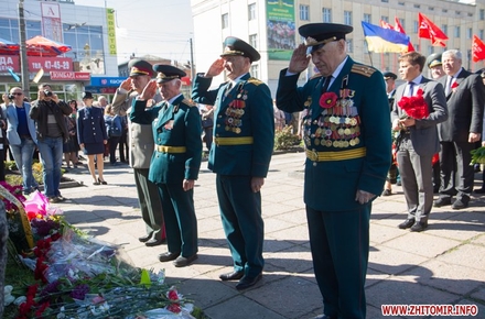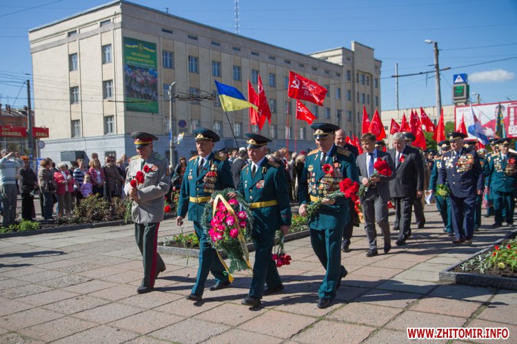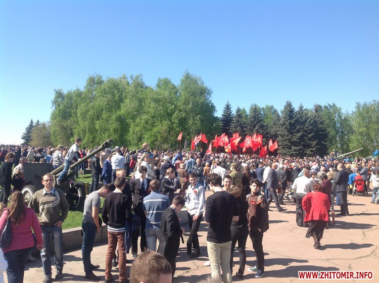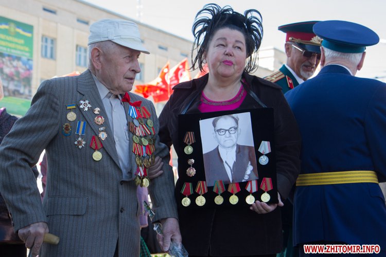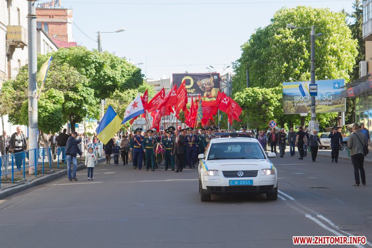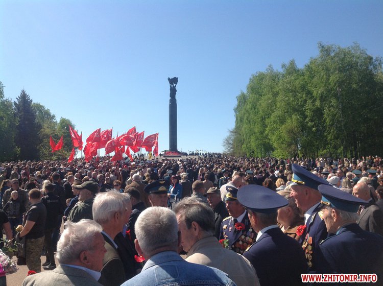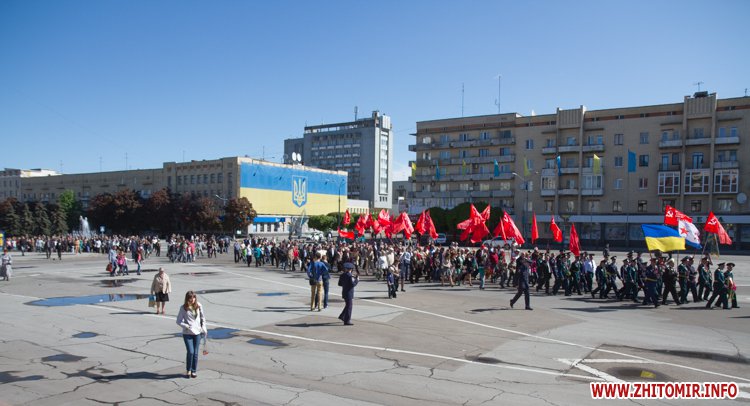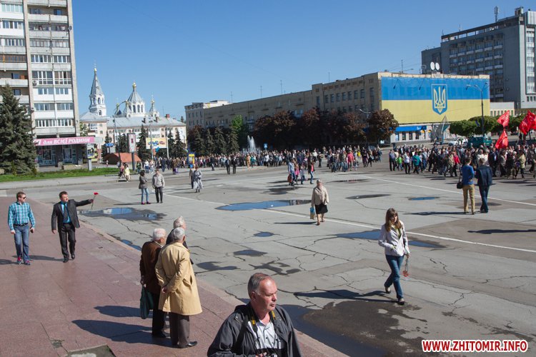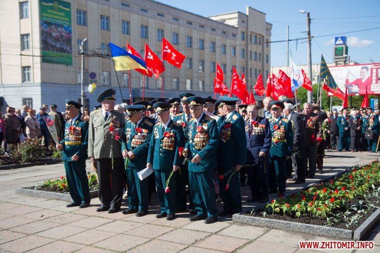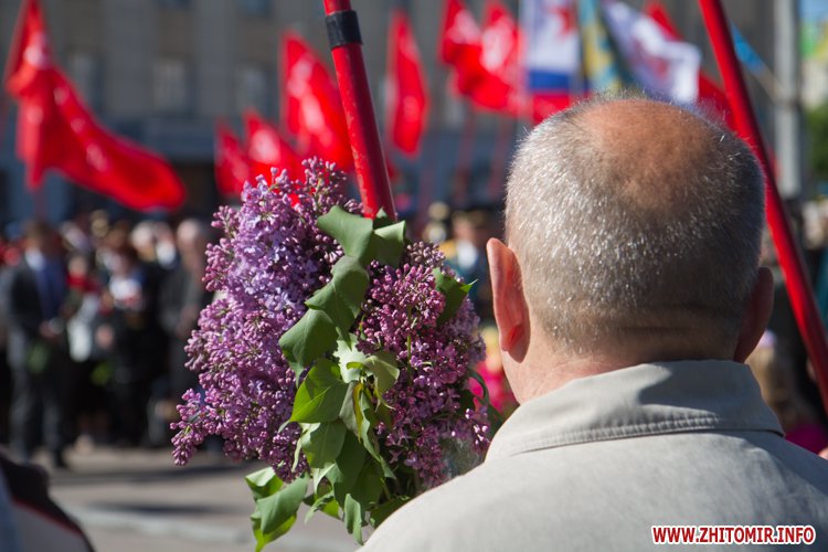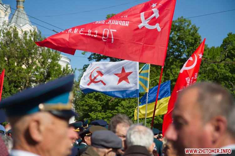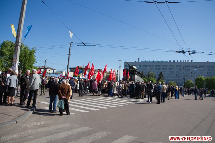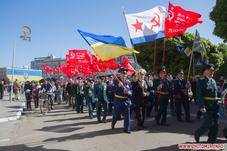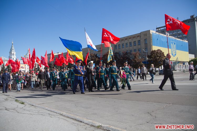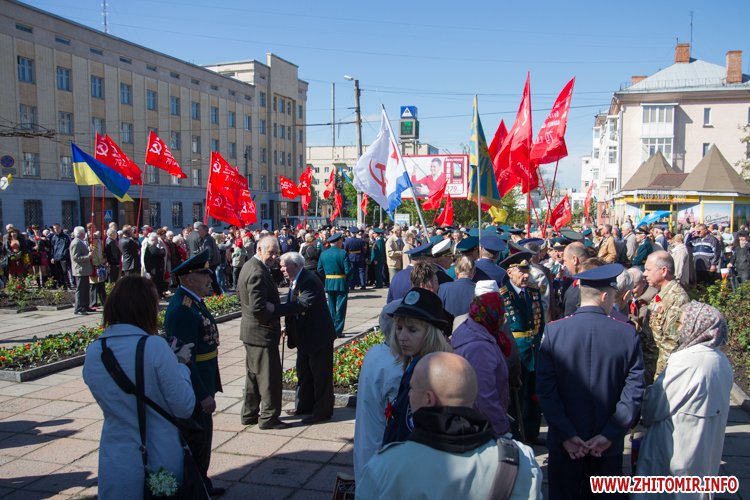 Кількасот людей зібрались зранку 9 травня на житомирському майдані Перемоги. Люди тримали в руках червоні бойові знамена Радянської армії та прапори України.