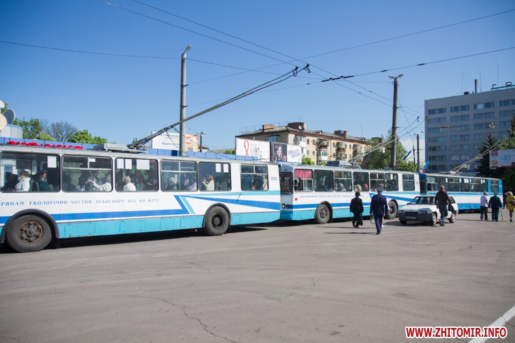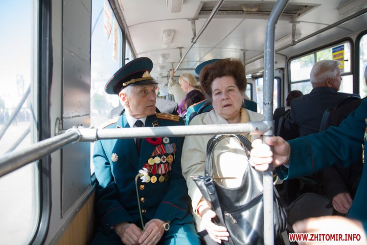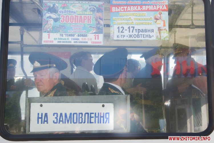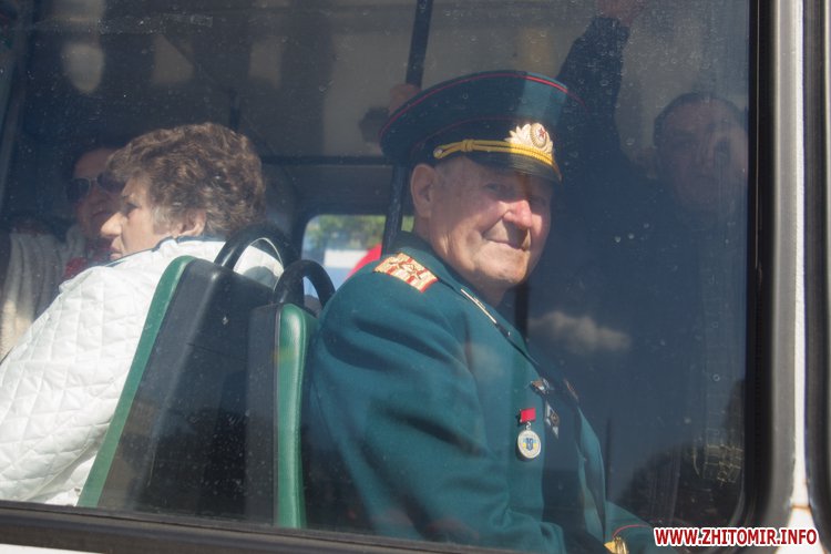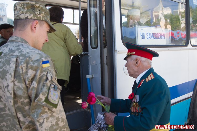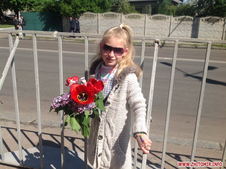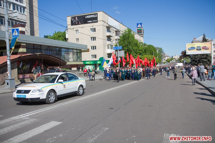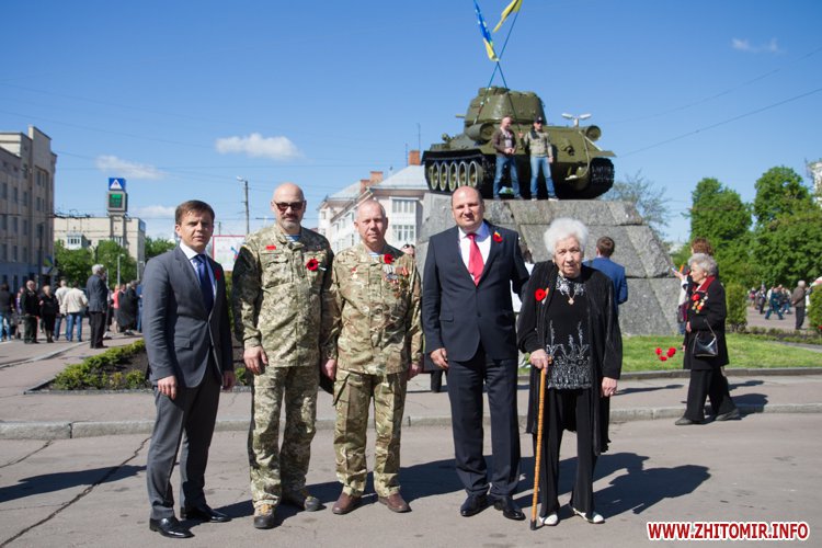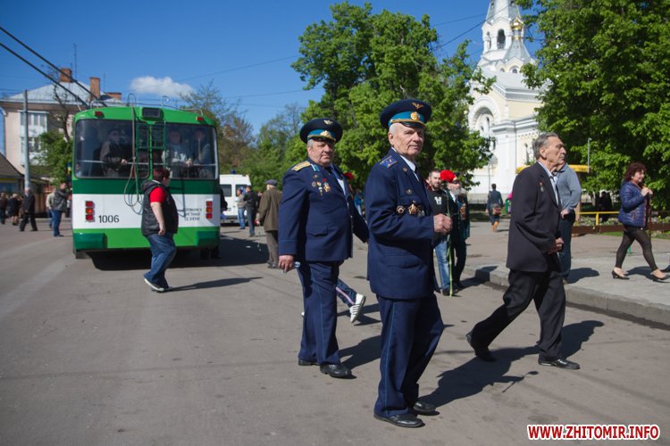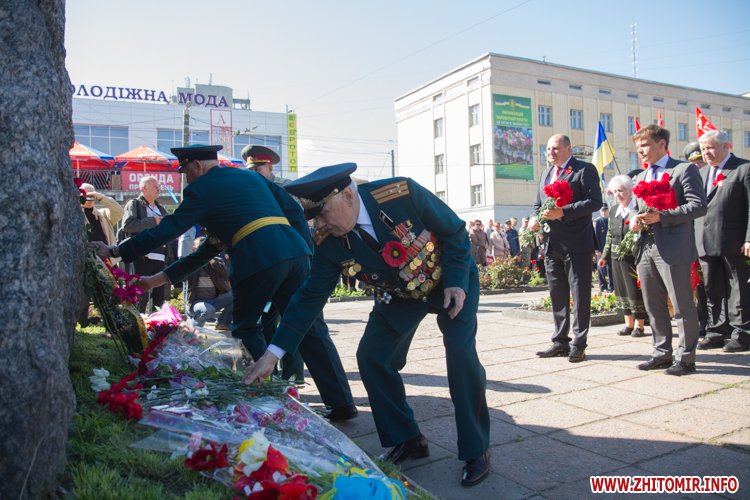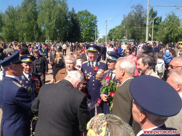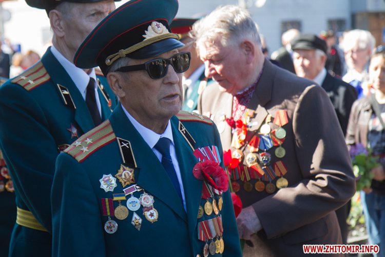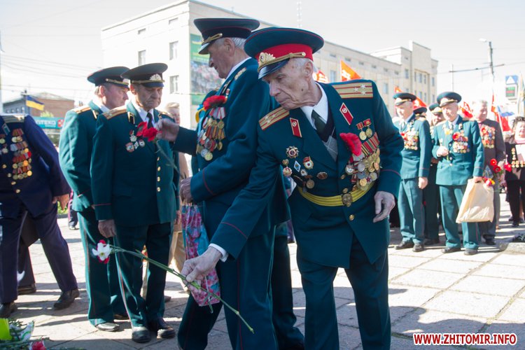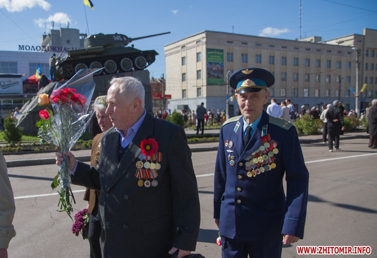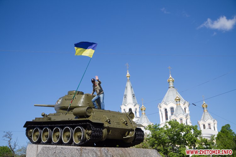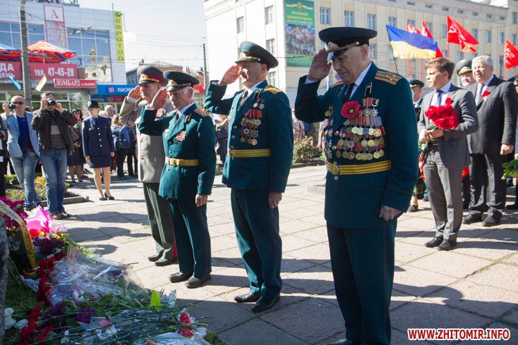 Кількасот людей зібрались зранку 9 травня на житомирському майдані Перемоги. Люди тримали в руках червоні бойові знамена Радянської армії та прапори України.