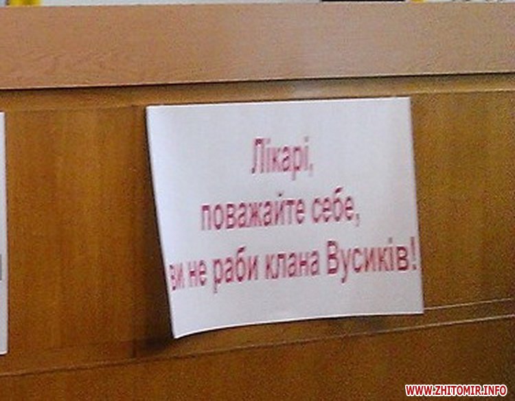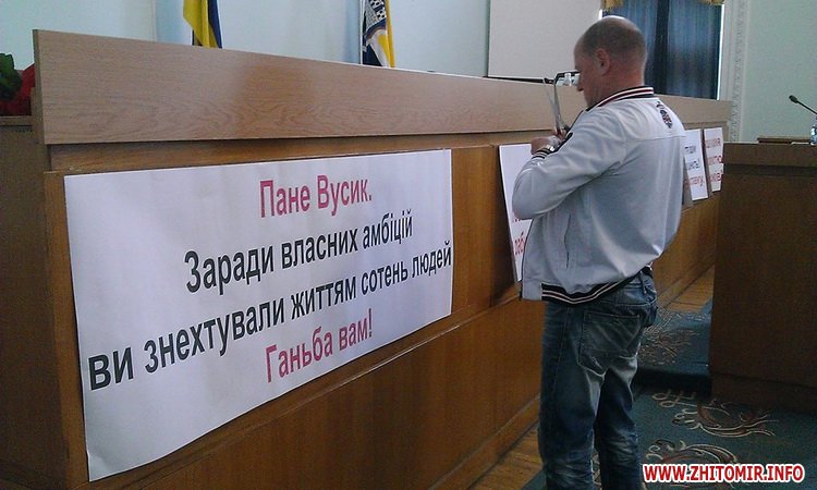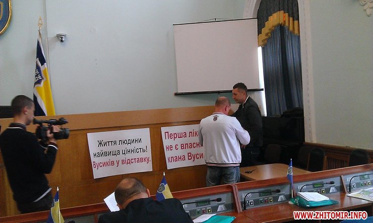 Перед началом сессии член исполкома горсовета Сергей Форест и активист Игорь Мали развесили на трибуне плакаты против главврача городской больницы №1 Вусыка.