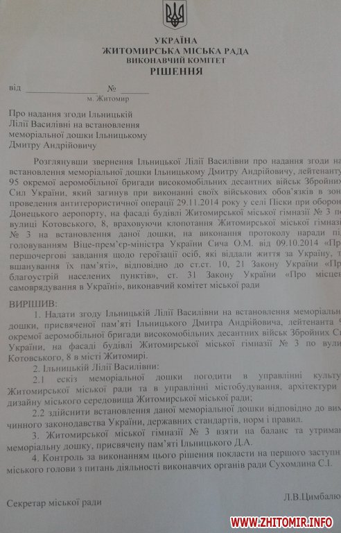 Мати загиблого біля села Піски лейтенанта Дмитра Ільницького отримала дозвіл на встановлення меморіальної дошки на фасаді гімназії №3 (вул.Котовського, 8).