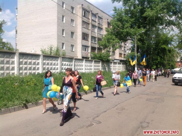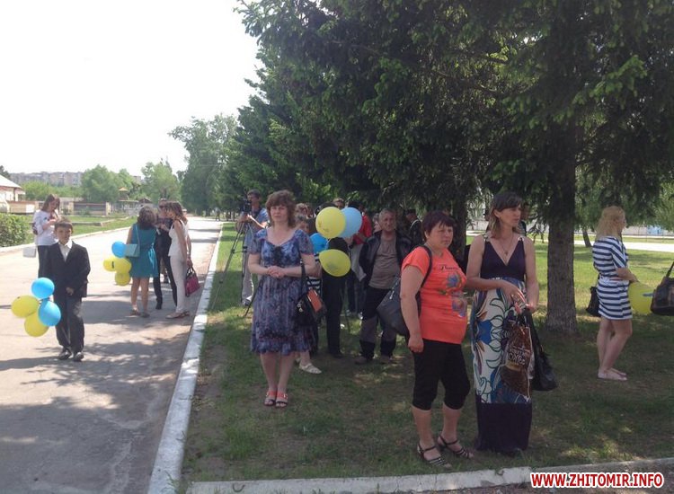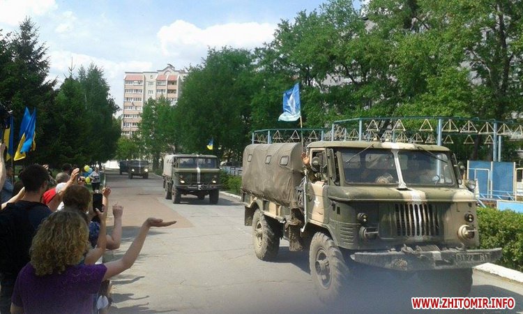 Колону військових на Богунії зустрічали кілька десятків житомирян, які принесли жовто-блакитні кульки, національні прапори та квіти. Дехто чекав на приїзд десантників з самого ранку.