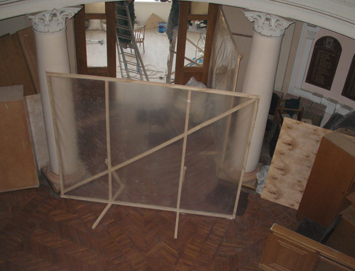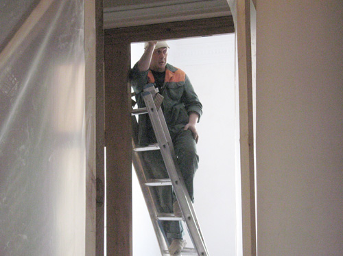 В Житомирском горисполкоме идет ремонт кабинета мэра. Как и положено при ремонте, по всему зданию разносится звук работающих электроинструментов. Около дверей в приемную поставлена перегородка из полиэтилена, которая, по замыслу рабочих, должна задерживать пыль и грязь, чтобы проходящие сотрудники и посетители не разносили ее на обуви по всему зданию.