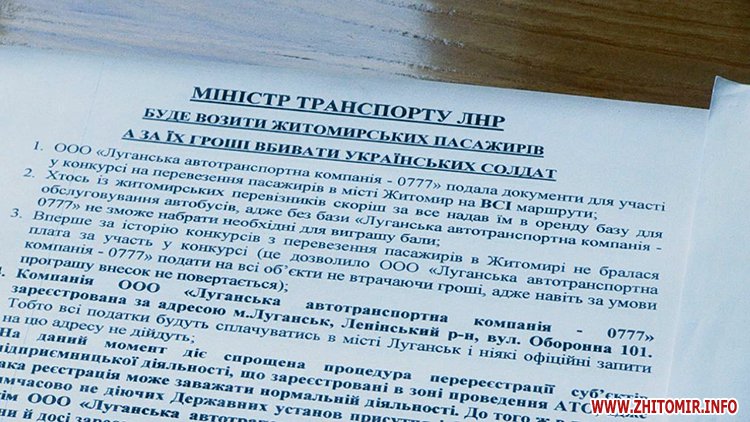 Депутати міськради поцікавились у заступнику мера про «Луганську автотранспортну компанію 0777», на яку, нібито, має вплив міністр транспорту, так званої «ЛНР», і яка подала заявку на участь у конкурсі на надання послуг пасажирських перевезень у Житомирі.