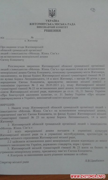 Меморіальну дошку почесному громадянину Житомира, письменнику Євгену Концевичу встановлять на фасаді гуманітарної гімназії №23, яка знаходиться на вул.Лятошинського. Заявку на встановлення дошки подавала громадська організація людей з інвалідністю «Молодь. Жінка. Сім’я».