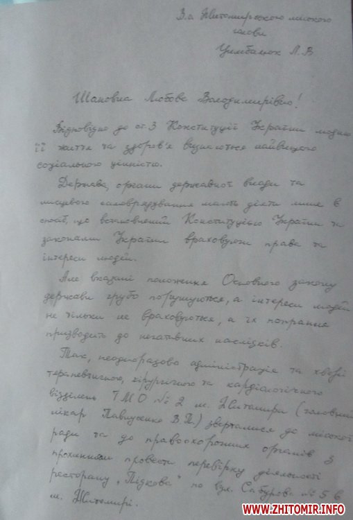 Обращение-жалобу на имя и.о. мэра Житомира Любови Цимбалюк от пациентов терапевтического, хирургического, кардиологического отделений больницы на заседании горисполкома 3 июня зачитала член исполкома Вера Савицкая.