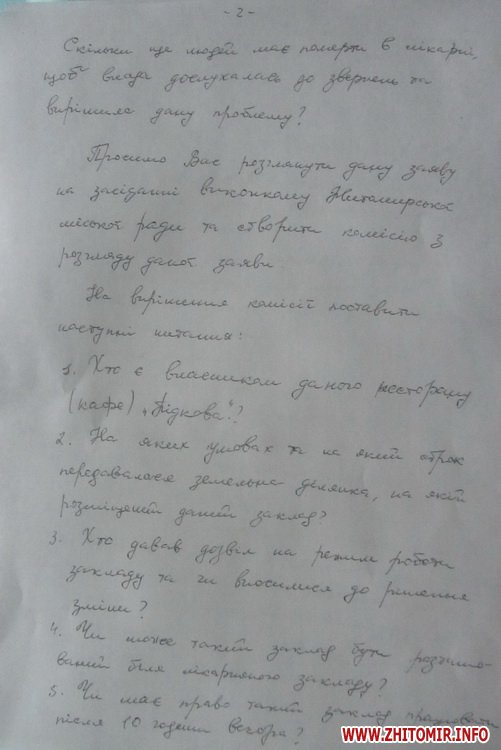 Пациенты центральной городской больницы №2 города Житомира жалуются на шум и громкую музыку, которые доносятся среди ночи из ресторана по улице Сабурова.
