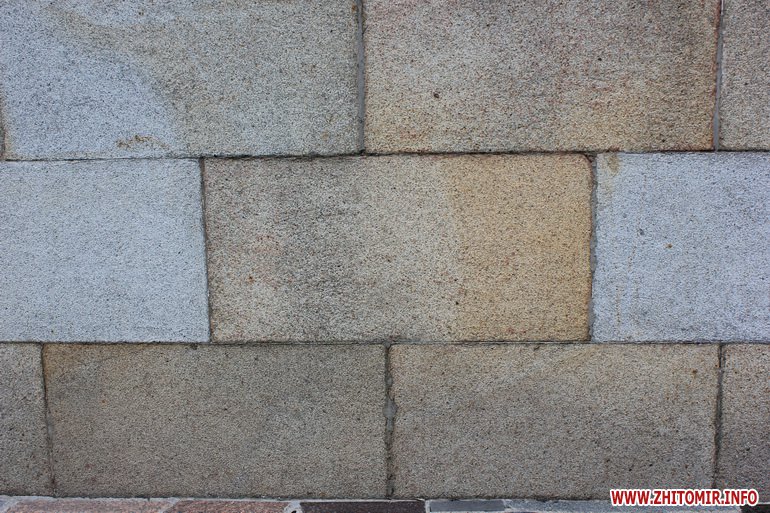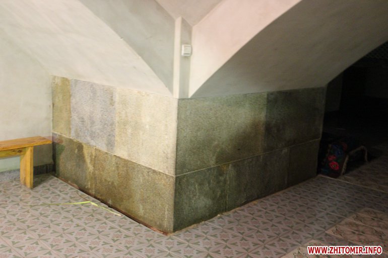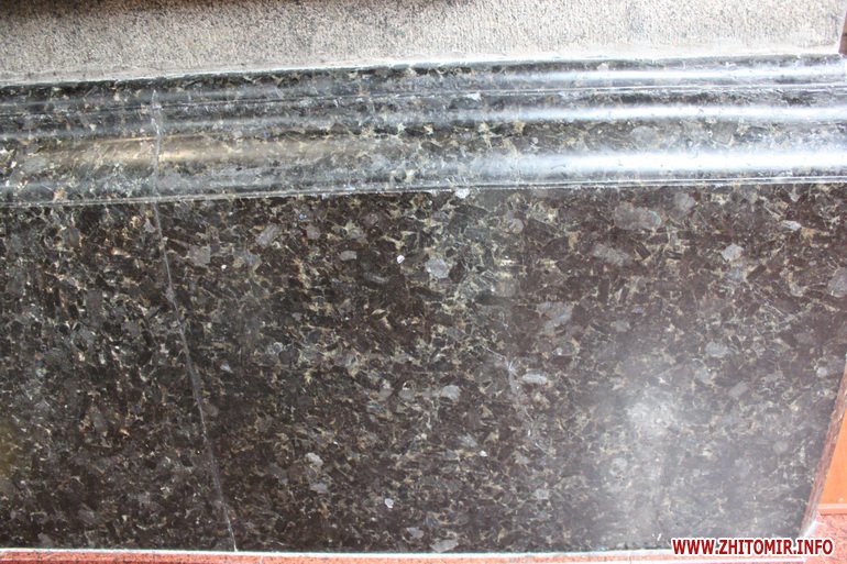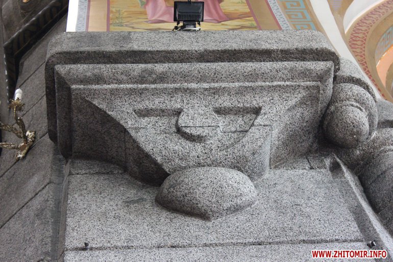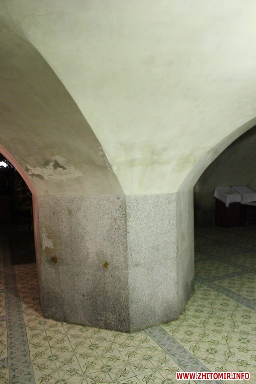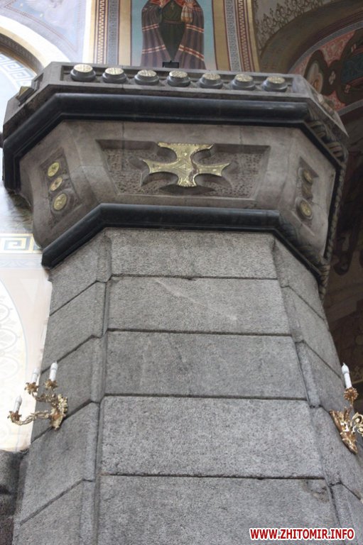 Осматривая верхнюю часть колонн, непроизвольно обращаешь внимание на каменотесную работу: кресты типа мальтийского, круги, другие древние изображения. Каждая колонна примерно на метр от пола облицована лабрадоритом со снятой широкой фаской. Это, словно, лишний раз напоминает о том, что Житомирщина имеет месторождения уникального во всем мире лабрадорита.