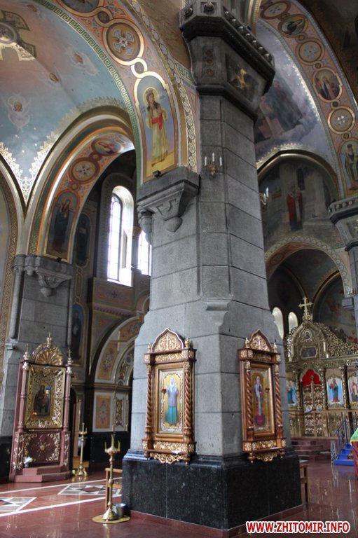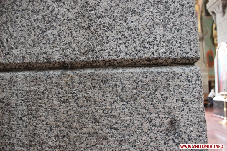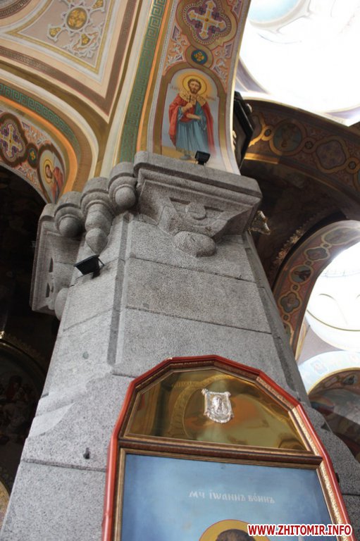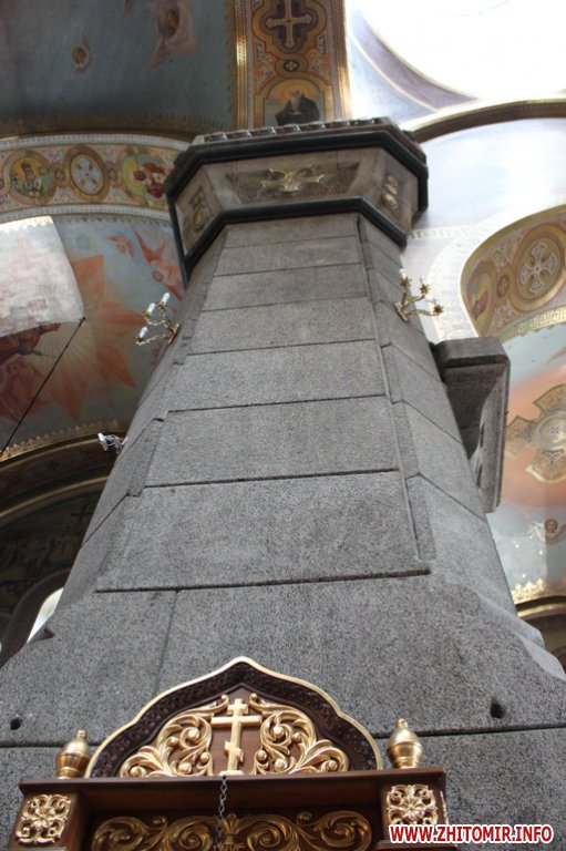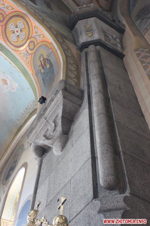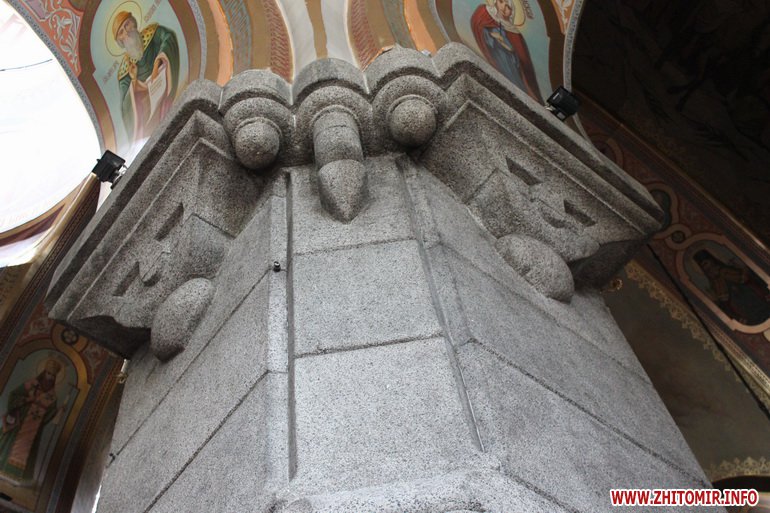 «Колонны Житомирского Спасо-Преображенского собора в своем роде уникальные, потому что изготовлены на высоком технологическом уровне. Стиль – старорусско-византийский, диаметр изделий – около двух метров, высота в главном храме – 15 метров. Колонны изготовленные из отдельных обработанных блоков высотой около 80 см. Примерный вес блока – 1,5 тонны, значит вся колона весит в приделах 15 тонн. Форма блоков прямоугольная, со срезанными углами. Между блоками – свинцовые прокладки, которые делают колонну фактически монолитом. Особенностью колонн главного храма – они идут на конус: снизу шире, сверху – сужение. Верхняя часть имеет форму капители с нависающими элементами. Этим достигается декоративное оформление и опорное дополнение для кирпичной кладки под сводами», - отмечает Виталий Беляев.